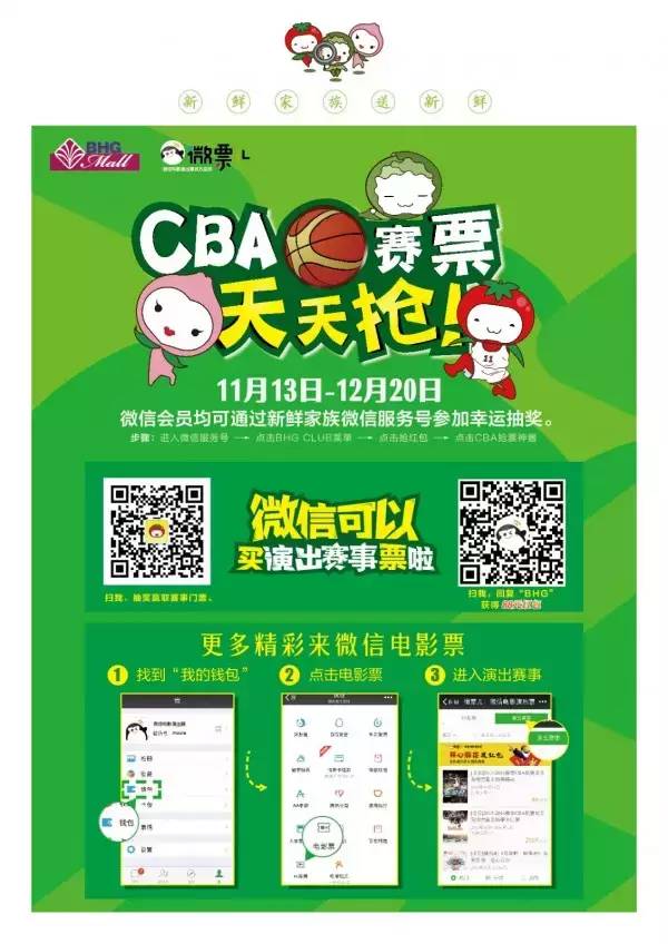 微信會(huì)員通過(guò)新鮮家族微信服務(wù)號(hào)(微信號(hào):BHG_xxjz),參加幸運(yùn)大轉(zhuǎn)盤(pán)抽獎(jiǎng), 即可享受CBA賽票天天搶活動(dòng),抽中就有大獎(jiǎng)。