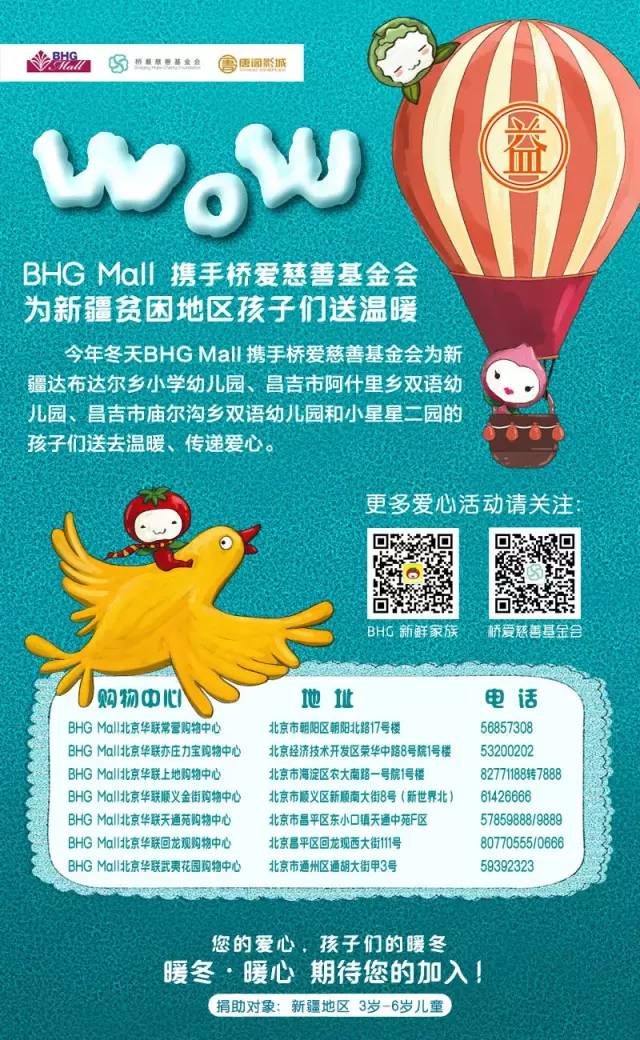 今年冬天,和我們一起來做公益,把您的舊衣服送到離您最近的BHG Mall服務(wù)臺,我們幫您送到新疆貧困的孩子們,同時為鼓勵您的愛心,BHG Mall還將送您貼心小禮物~